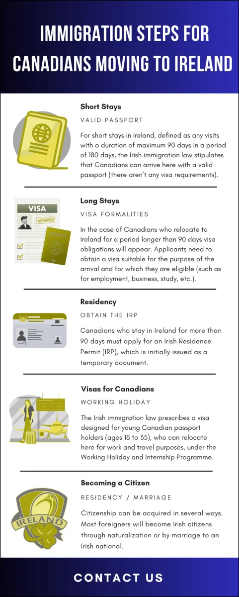 For those who want to move to Ireland from Canada, our lawyers can provide tailored assistance. They can assist clients in obtaining any type of visa for Ireland, including the spouse visa. Below, our infographic presents some of the immigration steps for Canadians moving to Ireland, so we invite you to read it if you want to relocate here as a Canadian: